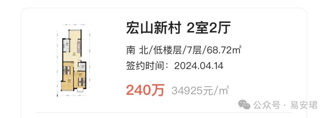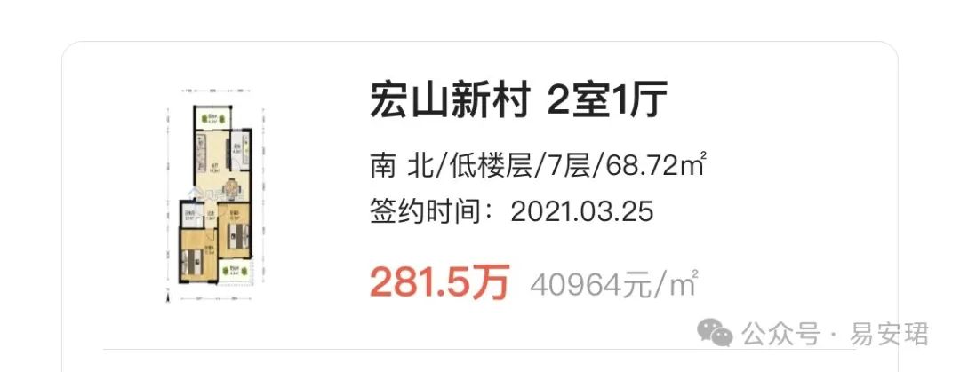 4、湖里金山板块——宏山新村68.72平2房,成交单价34925元/平,成交总价240万。2021年同户型成交单价40964元/平,成交总价281.5万;3年时间,总价调整了41.5万。