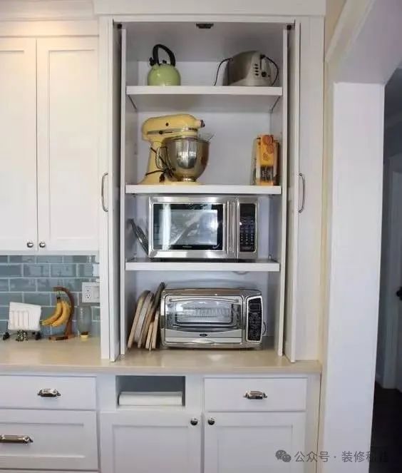 除空调外,像饮水机、小电视机等常用的小家电摆放也是个难题。可设计一个展示架或者收纳柜,依照电器的尺寸,预先设计出展示架、搁架的大小,如此,电器便能轻松放置进去了。再于搁架外面装设可自由滑动的磨砂玻璃门,平常无需使用时,磨砂玻璃门便能将电器隐藏起来,达成良好美观的视觉效果。