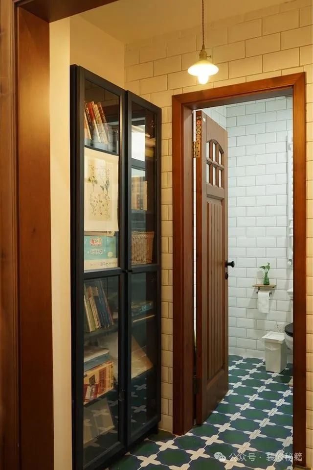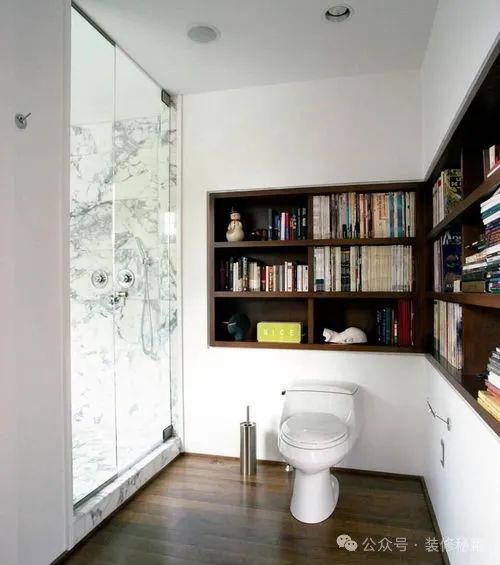 不少人有在卫生间里阅读的习惯,有一种做法是在卫生间门口装设书架,用于放置一些书籍,而书架旁边安置更衣柜,整个书架与衣柜合为一体,各自发挥作用。