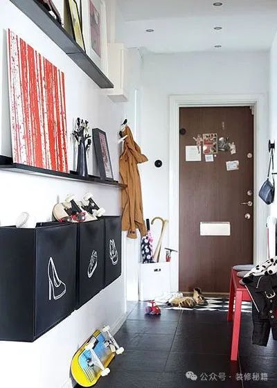 在狭窄空间里,装设一个悬挂式的鞋柜,柜体极为单薄,仅有一双鞋的宽度,如此既节省了空间,又注重了实用性。