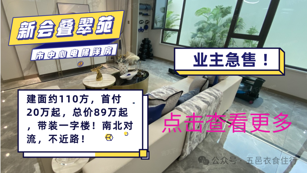 新会雍翠小苑,市中心电梯洋房,建面约95方,3房, 精装修,总价61.7万起,前后阳台,一字楼,不近路。业主急售!