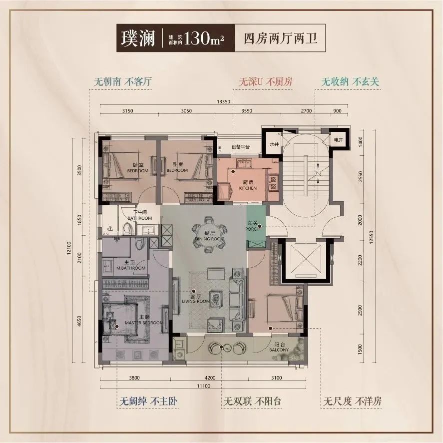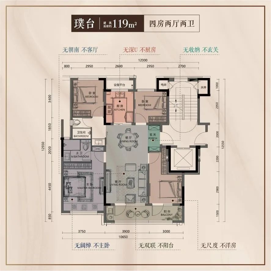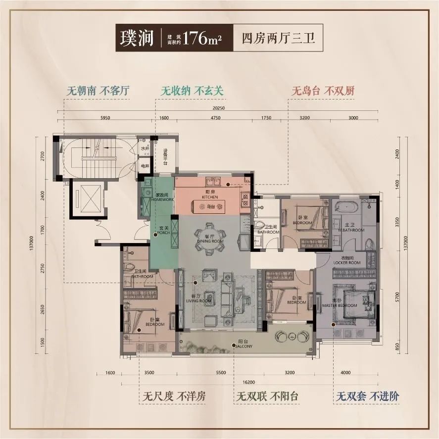 针对市面上户型普遍存在的厨房面积小、收纳空间少、客餐厅尺度不足、缺少各个家庭成员的独享空间等生活痛点,安璞轩的户型进行了精准的改造升级。