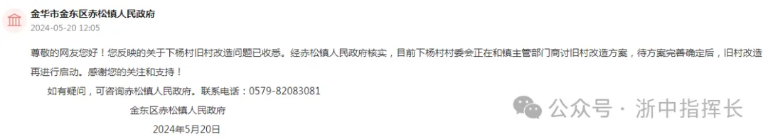 5月20日,赤松镇人民政府回复:经赤松镇人民政府核实,目前下杨村村委会正在和镇主管部门商讨旧村改造方案,待方案完善确定后,旧村改造再进行启动。感谢您的关注和支持!