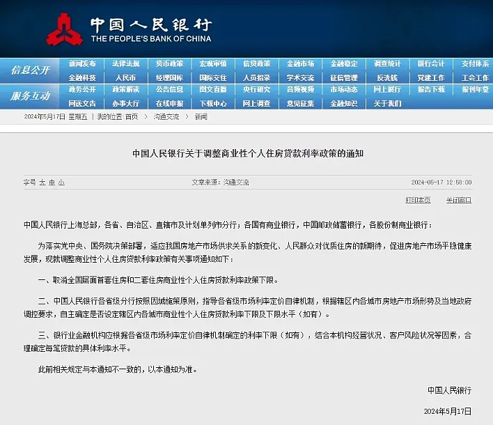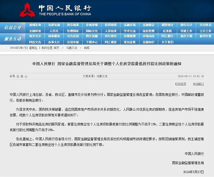 中国人民银行、国家金融监督管理总局5月17日发布通知称,为落实党中央、国务院决策部署,适应我国房地产市场供求关系的新变化、人民群众对优质住房的新期待,促进房地产市场平稳健康发展,调整个人住房贷款最低首付款比例政策。另据中国人民银行,个人住房公积金贷款利率、商业性个人住房贷款利率政策同步调整。