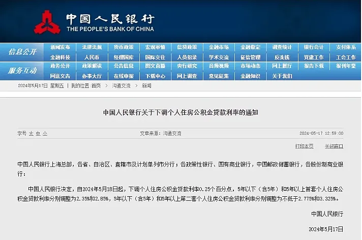 中国人民银行决定,自2024年5月18日起,下调个人住房公积金贷款利率0.25个百分点,5年以下(含5年)和5年以上首套个人住房公积金贷款利率分别调整为2.35%和2.85%,5年以下(含5年)和5年以上第二套个人住房公积金贷款利率分别调整为不低于2.775%和3.325%。