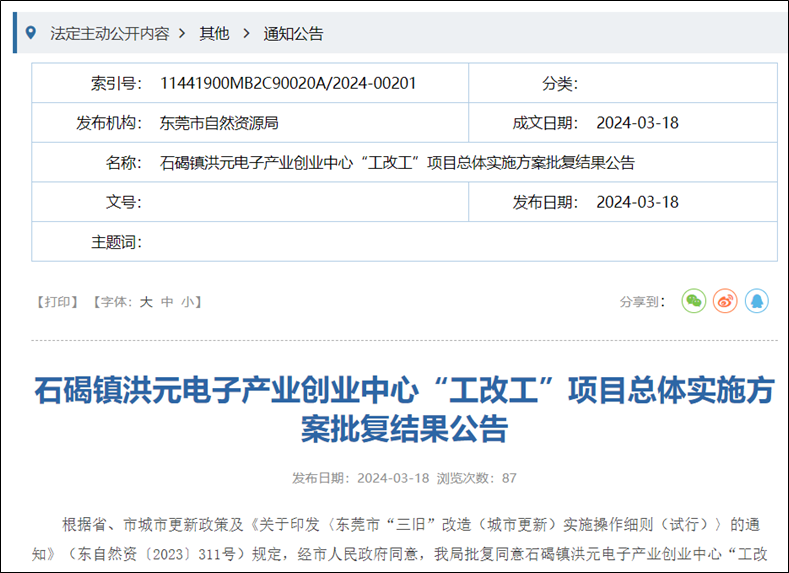 该更新单元位于虎门镇镇口社区镇业路与工业路交汇处 ,单元面积83678m²。以东莞市虎门镇镇口股份经济联合社为改造主体。
