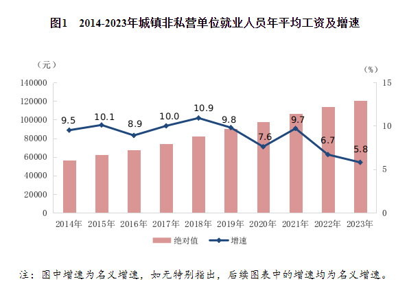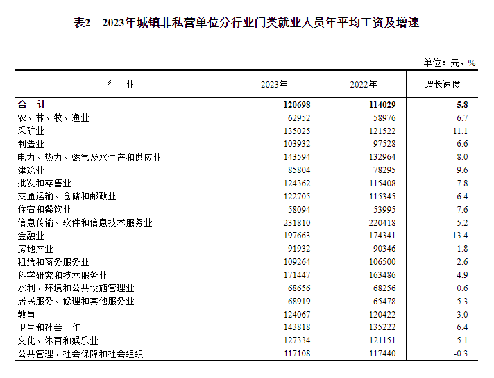 2023年,全国城镇非私营单位就业人员年平均工资为120698元,比上年增加6669元,名义增长5.8%,扣除价格因素实际增长5.5%。