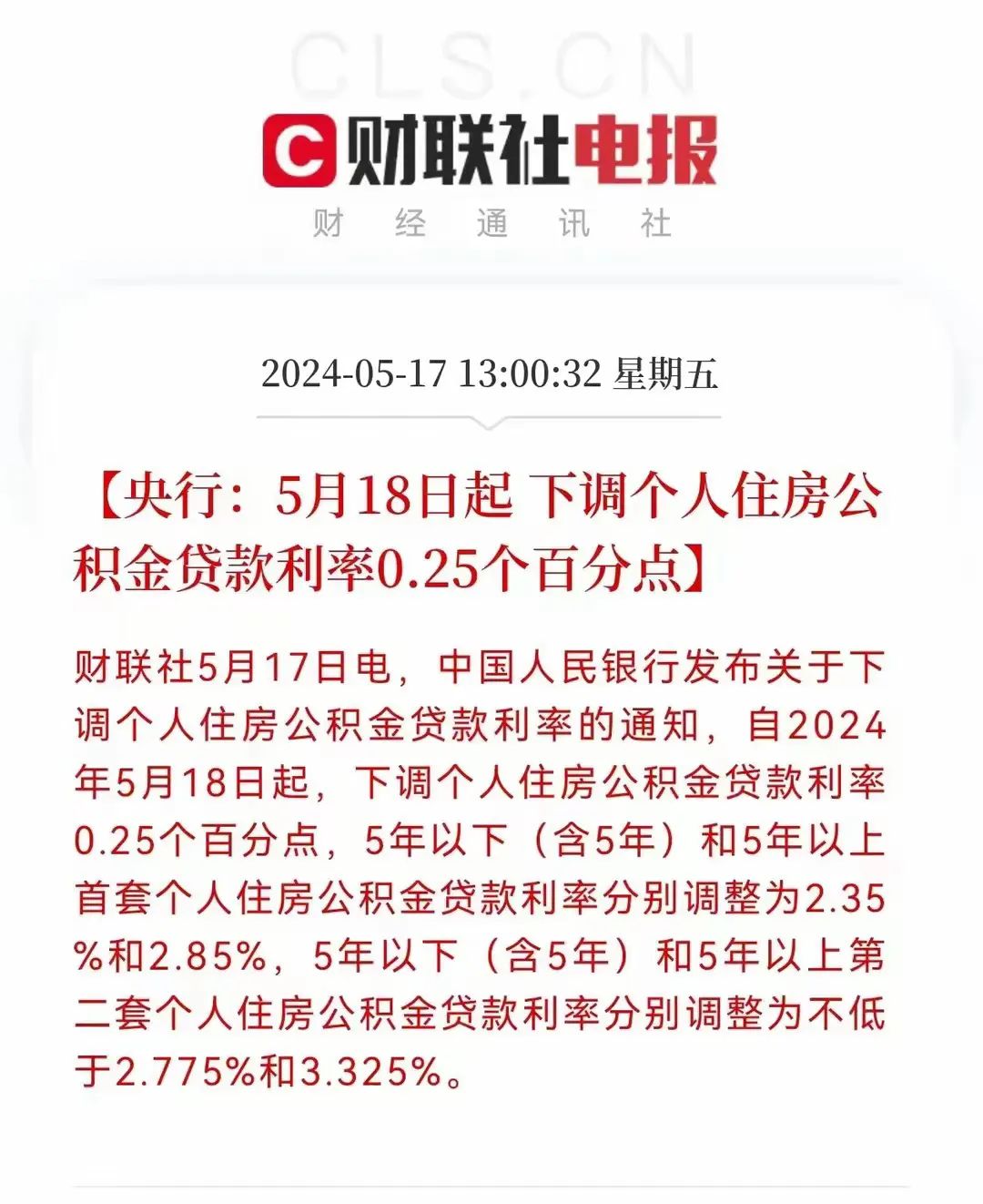 此外,央行还宣布,下调公积金贷款利率0.25个百分点,5年期以上首套公积金贷款利率降至2.85%,二套房贷利率降至3.325%!