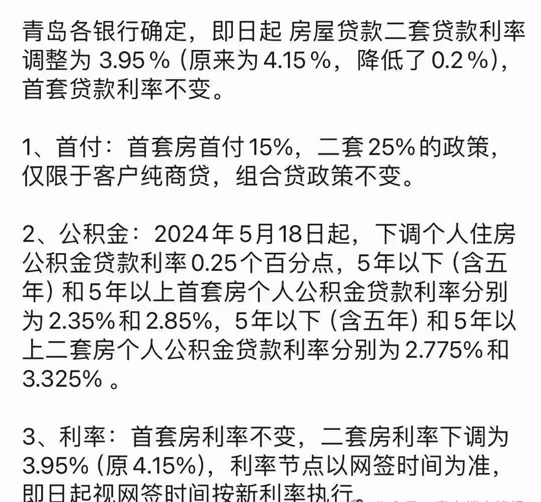 青岛各银行确定,即日起 房屋贷款二套贷款利率调整为 3.95%(原来为4.15%,降低了0.2%),首套贷款利率不变。