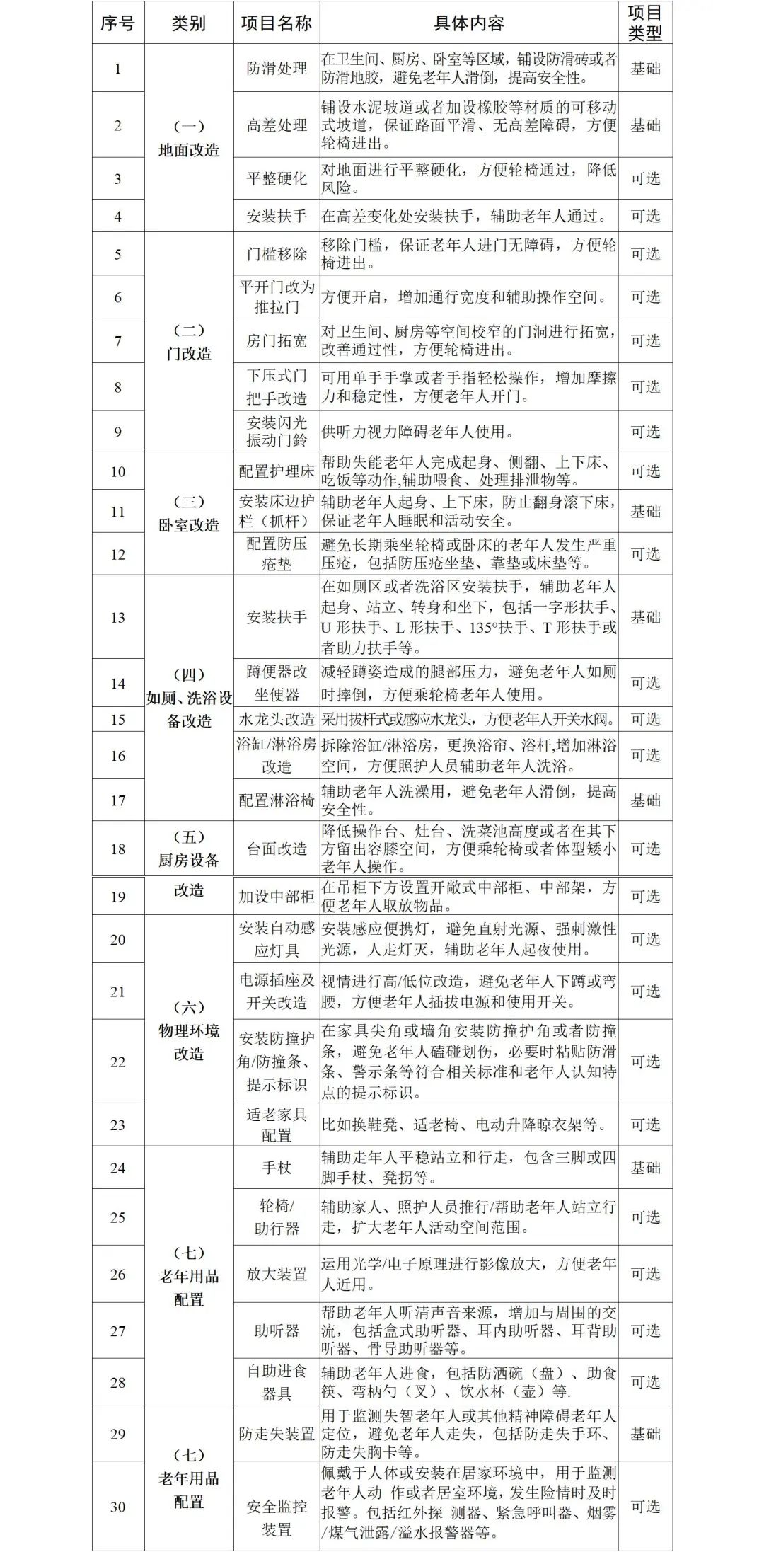 老年人居家适老化改造聚焦老年人居家生活照料、起居行走、康复护理等功能性需求,围绕“室内行走便利、如厕洗澡安全、厨房操作方便、居家环境改善、智能安全监护、辅助器具适配”等方面,可参考《居家适老化改造项目和老年用品配置推荐清单》: