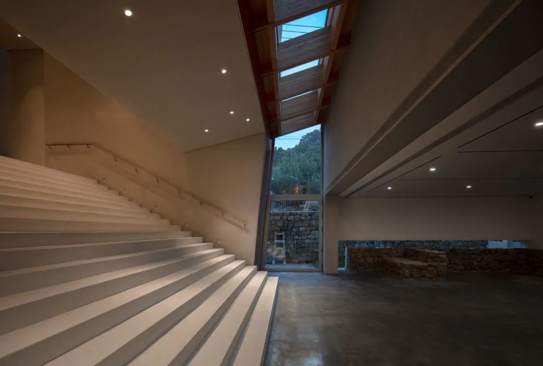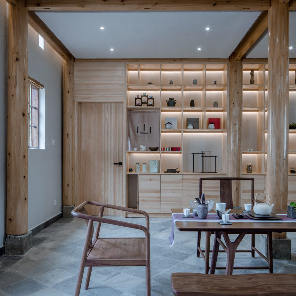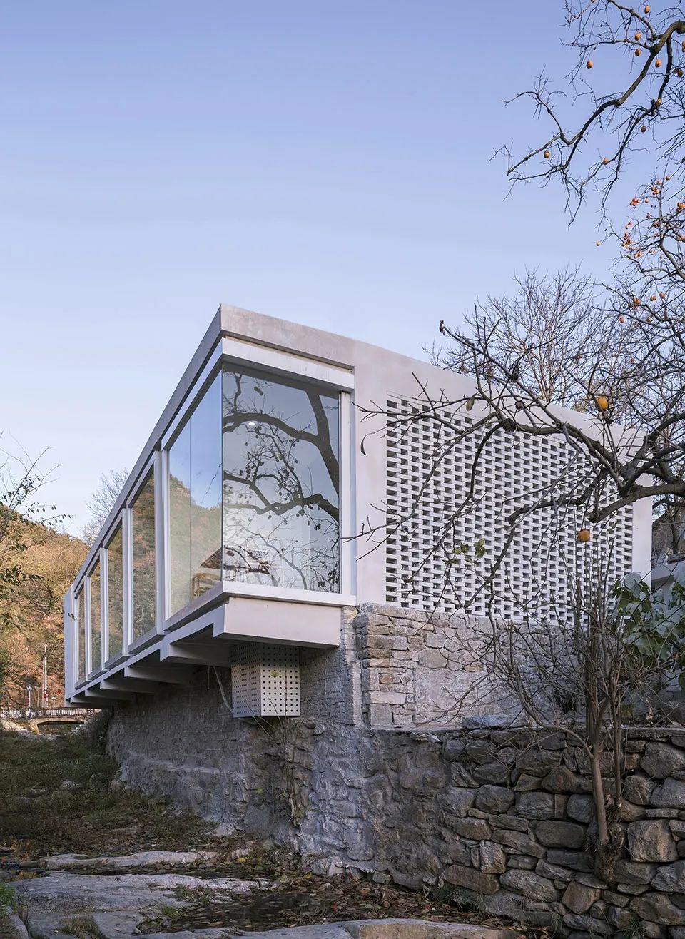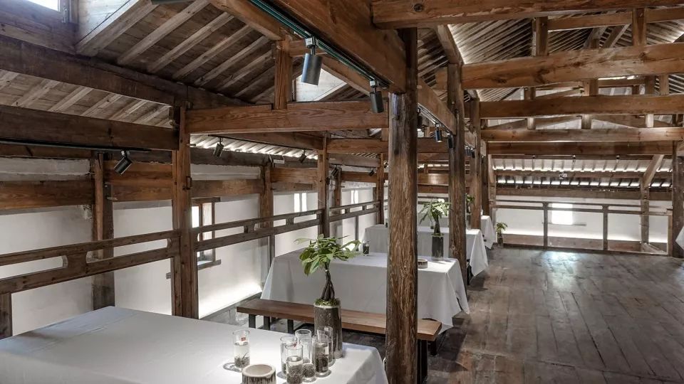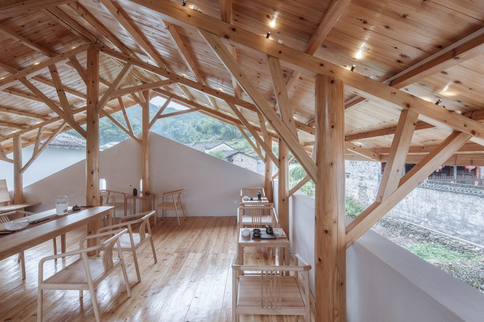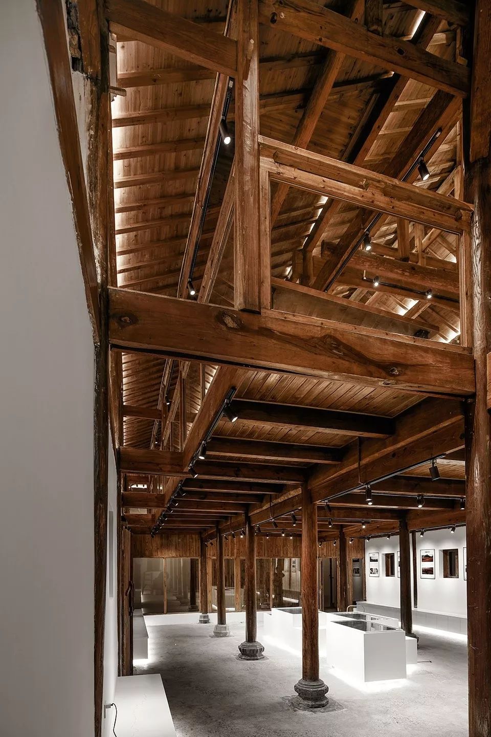 改造策略是在完善基本使用功能的前提下,让这个建筑更具有开放性与公共性,可为更多的人群服务,从建筑空间与结构上,创新的同时,又具有中国传统建筑的记忆与灵魂,使其与村落、与环境相协调,融为一体。设计师在一层保留并加固了内部的木结构,拆除了面向坝子的厚重墙体,以及内部隔墙,使一层完全开放,作为最重要的公共空间,可作为读书阅览、酒吧、会议等多种功能。重新设计的钢网架玻璃门,可以存储木柴,在完全打开的时候,将室内外融为一体。安吉山川乡村记忆馆