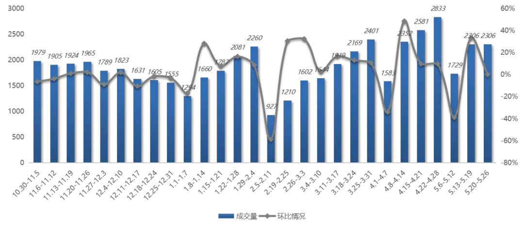 南京全市二手房成交2306套(含高淳、溧水),环比持平,其中主城九区成交量2126套。从成交走势来看,517新政以来,南京二手房成交量连续2周保持高位,周交易量稳定在2300套,市场新增需求环比有所增加;结合当前成交节奏,预计5月全市二手房成交量将在8600套左右。2023-2024年南京二手住宅逐周成交量及环比情况