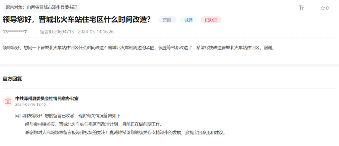 领导您好,想问一下晋城北火车站住宅区什么时间改造?晋城北火车站周边的孟匠,侯匠等村都改造了,希望尽快改造晋城北火车站住宅区,谢谢。