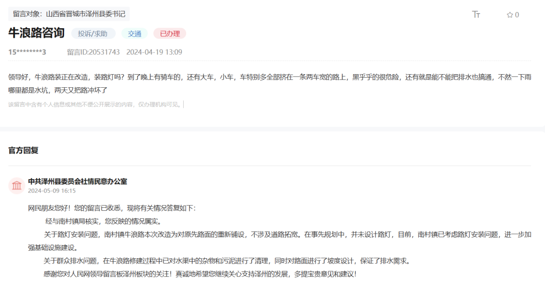 下一步,我办将继续督促南村镇积极开展拆迁工作和照明设施安装工作。