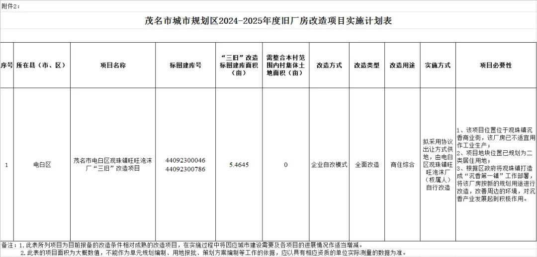 附件2:茂名市城市规划区2024-2025年度旧厂房改造项目实施计划表