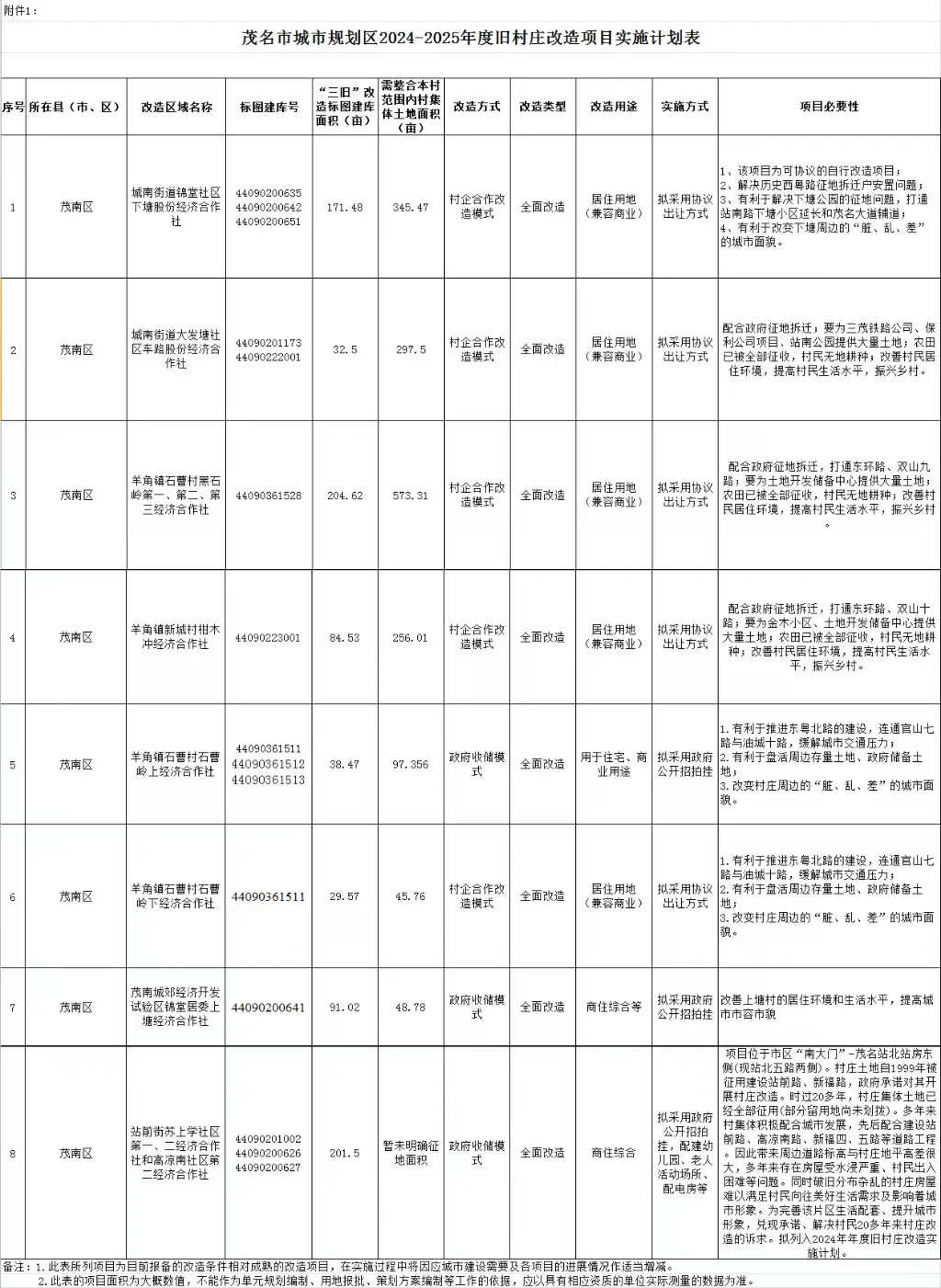 1、茂名市城市规划区2024-2025年度旧村庄改造项目实施计划表.xls