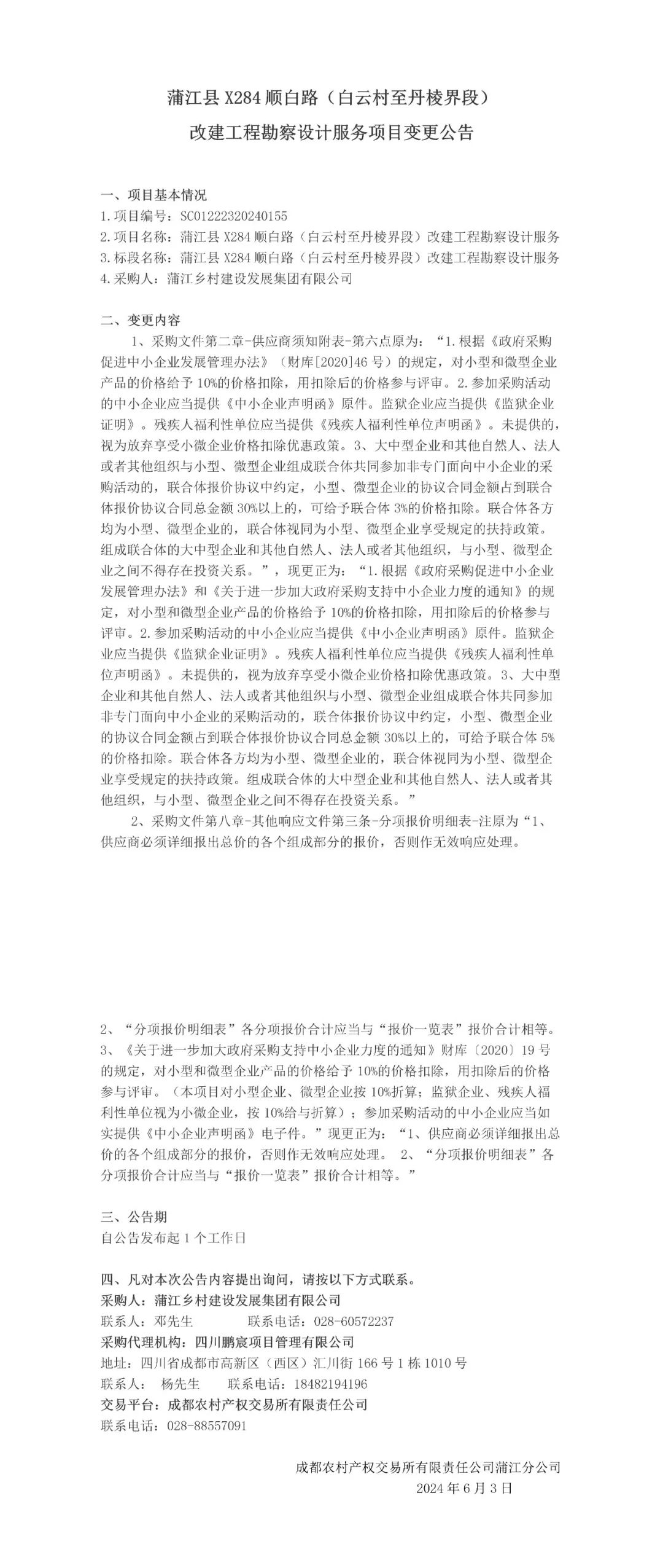 蒲江县X284顺白路(白云村至丹棱界段)改建工程勘察设计服务项目变更公告