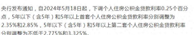 最后,我们再来回顾一下这次政策调整的主要内容:央行自5月18日起下调个人住房公积金贷款利率0.25个百分点。首套住房公积金贷款利率:5年以下(含5年)为2.35%,5年以上为2.85%。第二套住房公积金贷款利率:5年以下(含5年)不低于2.775%,5年以上不低于3.325%。这是自2022年以来第二次下调住房公积金贷款利率,调整幅度更大。本次调整惠及首套和二套房公积金贷款购房者。